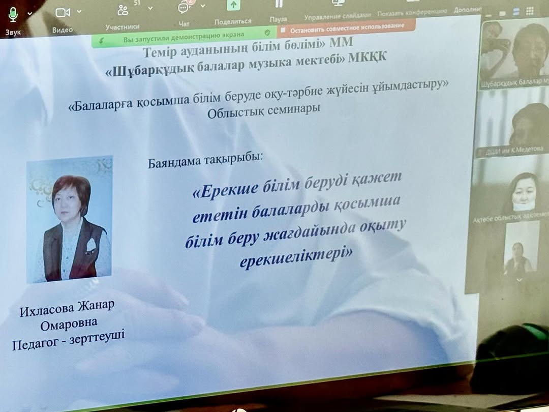 Ақтөбе облыстық әдістемелік орталығының ұйымдастыруымен “Балаларға қосымша білім беруде оқу-тәрбие жүйесін ұйымдастыру” тақырыбында облыстық семинар өтті. Семинар барысында мектебіміздің оқу-ісі орынбасары Ихласова Жанар Омаровна «Ерекше білім беруді қажет ететін балаларды қосымша білім беру жағдайында оқыту ерекшеліктері» тақырыбында баяндама оқыды.