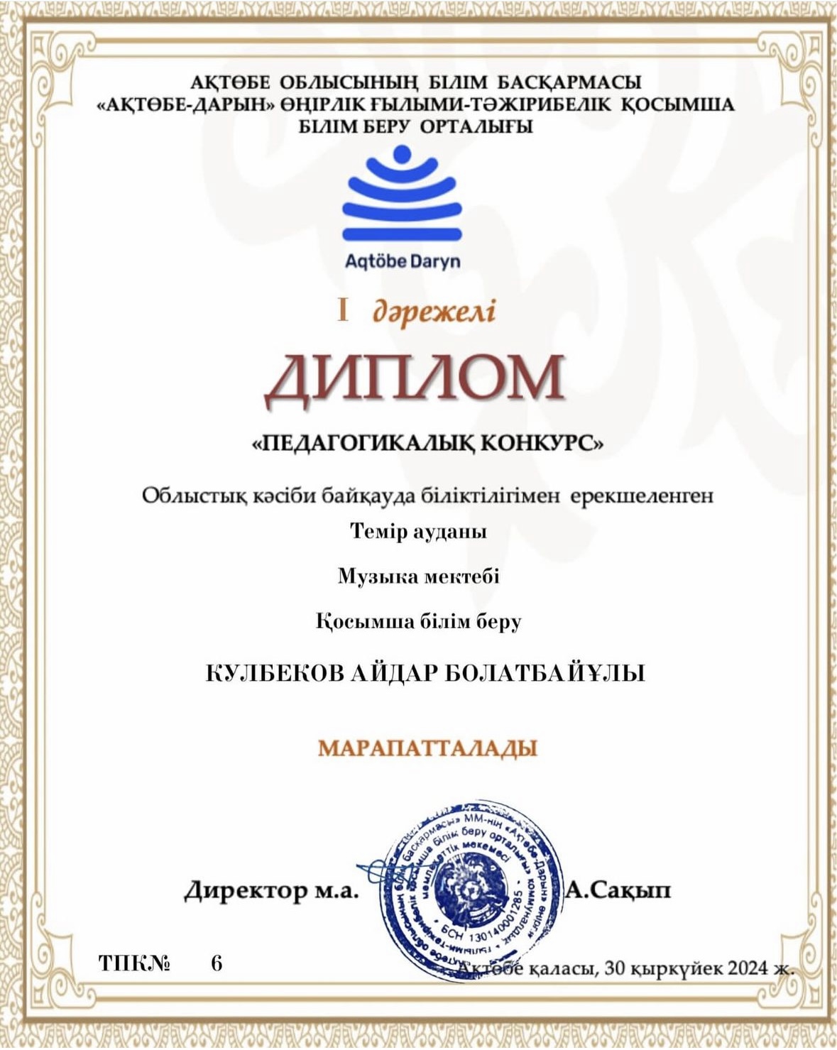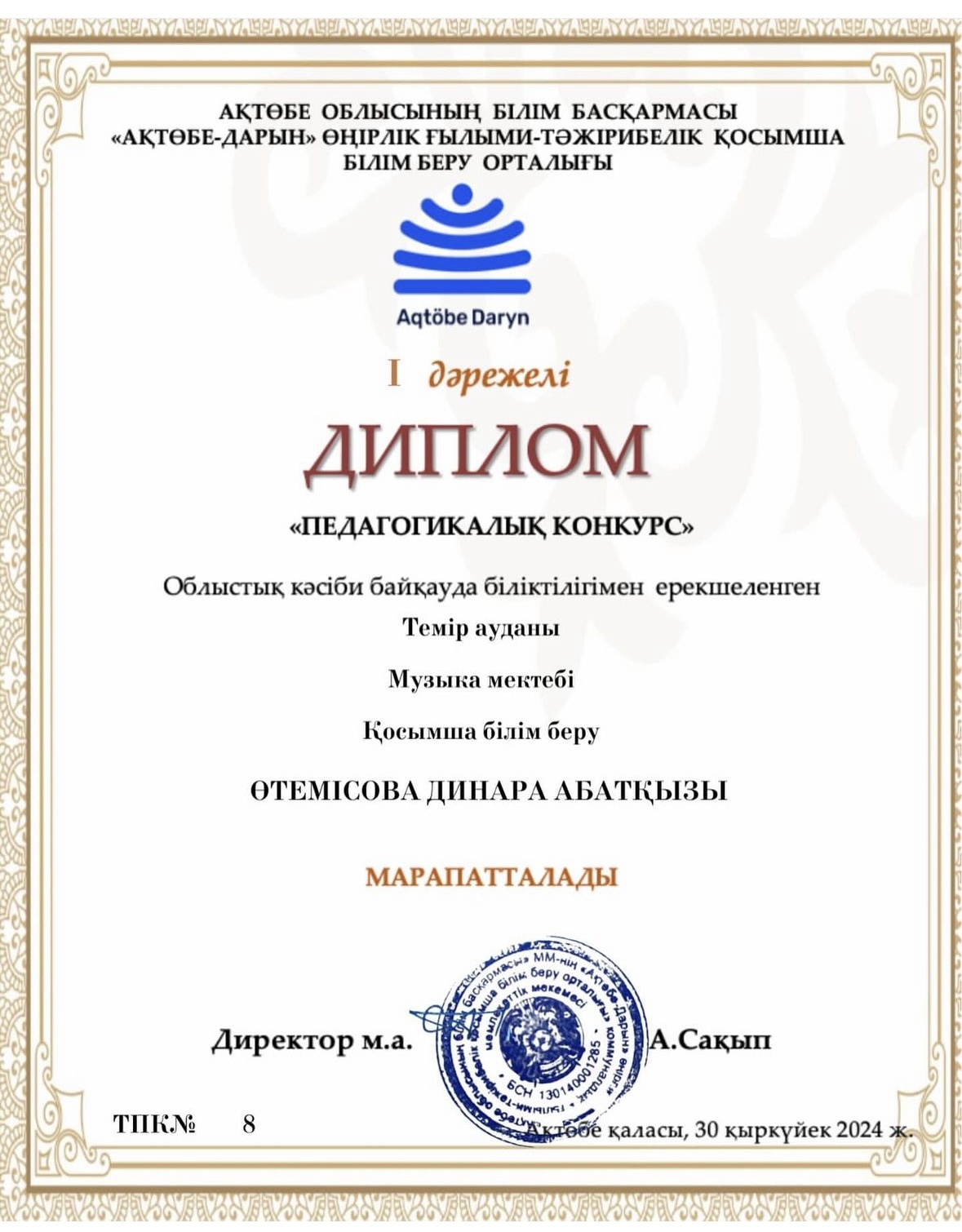 АҚТӨБЕ ОБЛЫСЫНЫҢ БІЛІМ БАСҚАРМАСЫ «АҚТӨБЕ — ДАРЫН» ӨҢІРЛІК ҒЫЛЫМИ — ТӘЖІРИБЕЛІК ҚОСЫМША БІЛІМ БЕРУ ОРТАЛЫҒЫ ұйымдастырған «Педагогикалық конкурс» Облыстық кәсіби байқауында біліктілігімен ерекшеленген әріптестеріміз жүлделі І — ІІ орындарды иеленді.