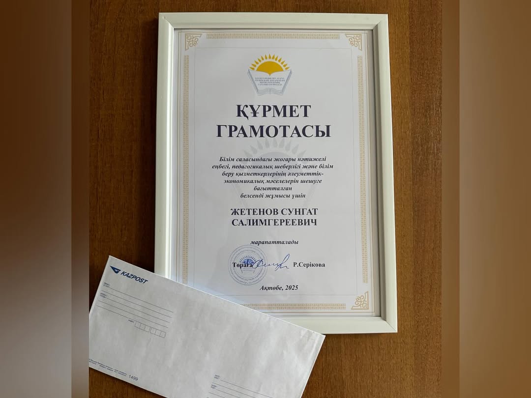 Білім саласындағы жоғары нәтижелі еңбегі, педагогикалық шеберлігі және білім беру қызметкерлерінің әлеуметтік- экономикалық мәселелерін шешуге бағытталған белсенді жұмысы үшін мектебіміздің директоры Жетенов Сұңғат Сәлімгерейұлы Ақтөбе облыстық ұйымының төрағасы Р. Серікованың Құрмет грамотасымен және сыйақымен марапатталды.
