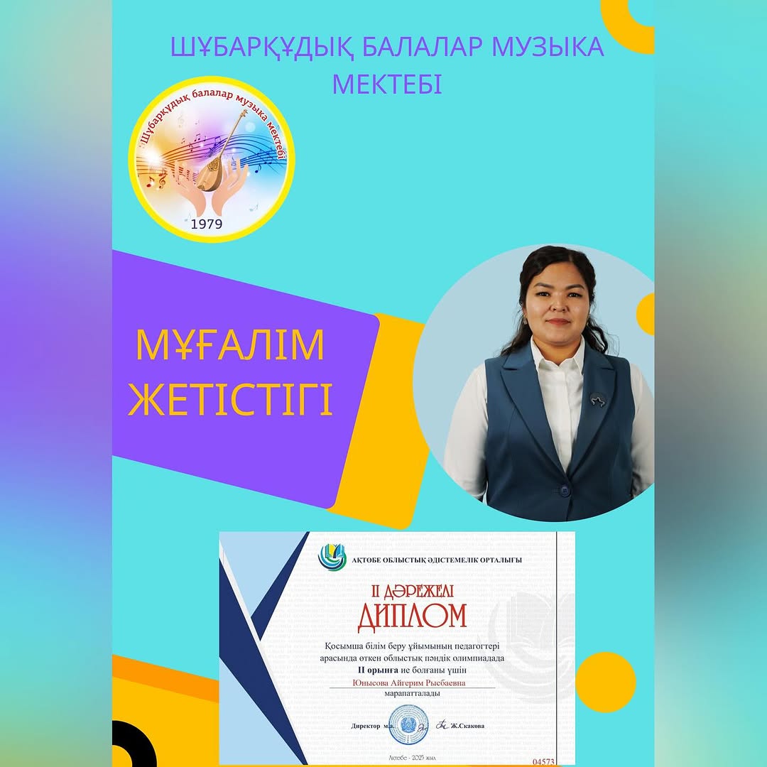 Ақтөбе облыстық әдістемелік орталығы ұйымдастырған Қосымша білім беру ұйымының педагогтері арасында өткен облыстық пәндік олимпиадада мектебіміздің баян класының мұғалімі Юнысова Айгерим Рысбаевна ІІ дәрежелі Дипломмен марапатталды.