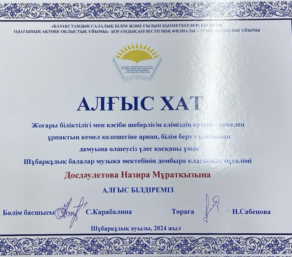 «Қазақстандық салалық білім және ғылым қызметкерлері кәсіптік одағының Ақтөбе облыстық ұйымы» қоғамдық бірлестігінің филиалы - Темір аудандық ұйымының төрайымы Н.Ж. Сабенова мен Темір ауданының білім бөлімінің басшысы С.М. Карабалина атынан Алғыс хатпен және Сарыағаш шипажайына сертификатпен мектебіміздің домбыра класының мұғалімі Досдаулетова Назира Мұратқызы марапатталды.