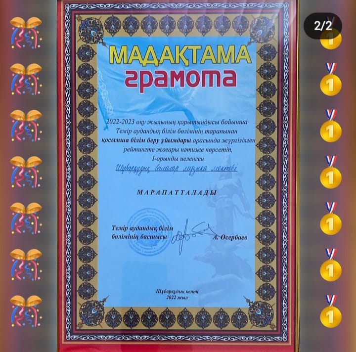 2022-2023 оқу жылының қорытындысы бойынша Темір аудандық білім бөлімінің тарапынан қосымша білім беру ұйымдарының арасында жүргізілген рейтингте, мектебіміз 1-орын, Темір аудандық білім бөлімінің басшысы А.М.Өсербаевтың «МАДАҚТАМАСЫМЕН» марапатталды.