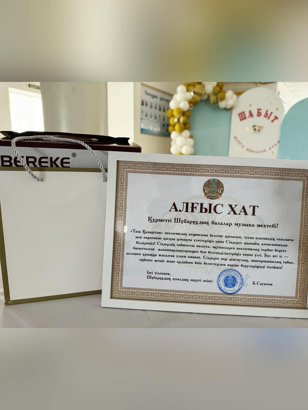 “Таза Қазақстан” экологиялық акциясына белсене қатысып, туған өлкеміздің тазалығы мен көркеюіне қосқан қомақты үлестеріңіз үшін Сіздерге шынайы алғысымызды білдіреміз! Сіздердің табиғатты аялауға, оқушыларға экологиялық тәрбие беруге бағытталған жанашырлықтарыңыз бен белсенділіктеріңіз көпке үлгі. Бұл игі іс - келешек ұрпаққа жасалған үлкен аманат. Сіздерге зор денсаулық, шығармашылық табыс, еңбекте жеміс және әрдайым биік белестерден көріне берулеріңізді тілейміз!