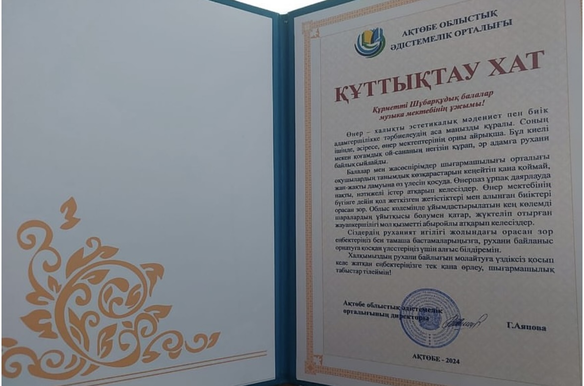 «Ән мен саздың мекеніне - 45 жыл» Ақтөбе облыстық әдістемелік орталығының директоры Г. Аяпованың құттықтау хатымен Шұбарқұдық балалар музыка мектебінің ұжымы марапатталды.
