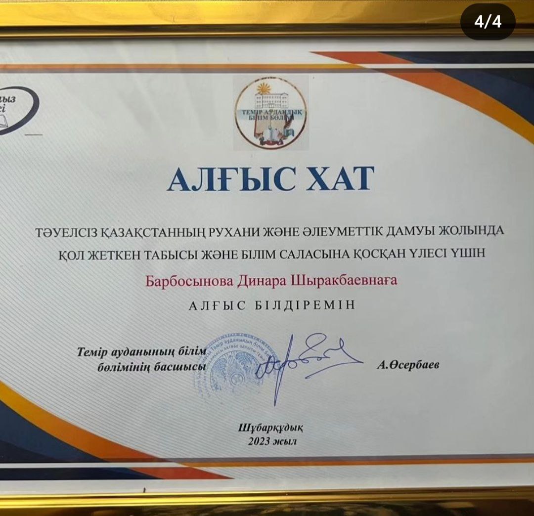 Тәуелсіз Қазақстанның рухани және әлеуметтік дамуы жолында қол жеткен табысы және білім саласына қосқан үлесі үшін домбыра класының мұғалімі Барбосынова Динара Шырақбайқызы Темір аудандық білім бөлімінің басшысы Өсербаев Азамат Мәлікұлының «АЛҒЫС ХАТЫМЕН» марапатталды.