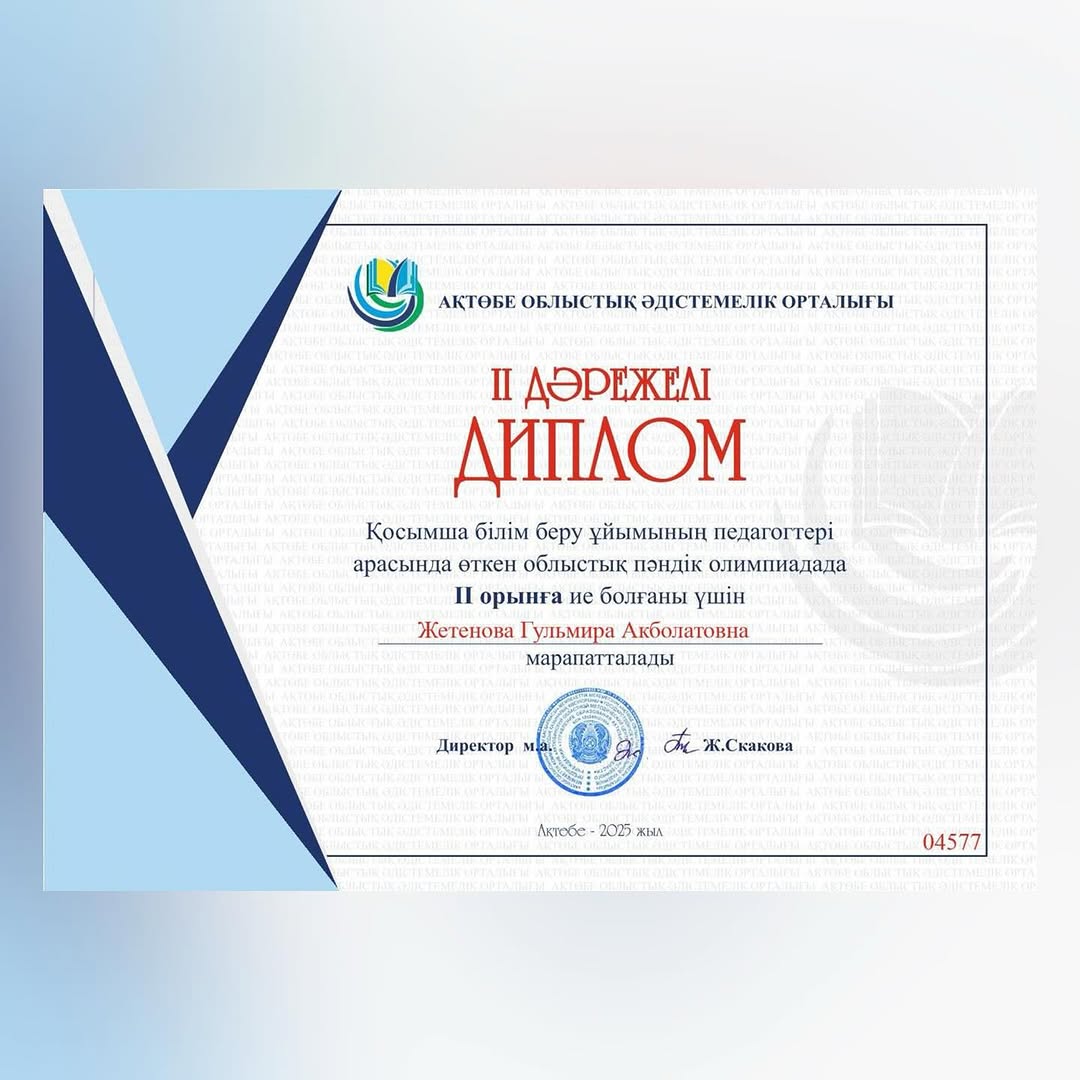 Ақтөбе облыстық әдістемелік орталығы ұйымдастырған Қосымша білім беру ұйымының педагогтері арасында өткен облыстық пәндік олимпиадада мектебіміздің баян класының мұғалімі Жетенова Гульмира Акболатқызы ІІ дәрежелі Дипломмен марапатталды.