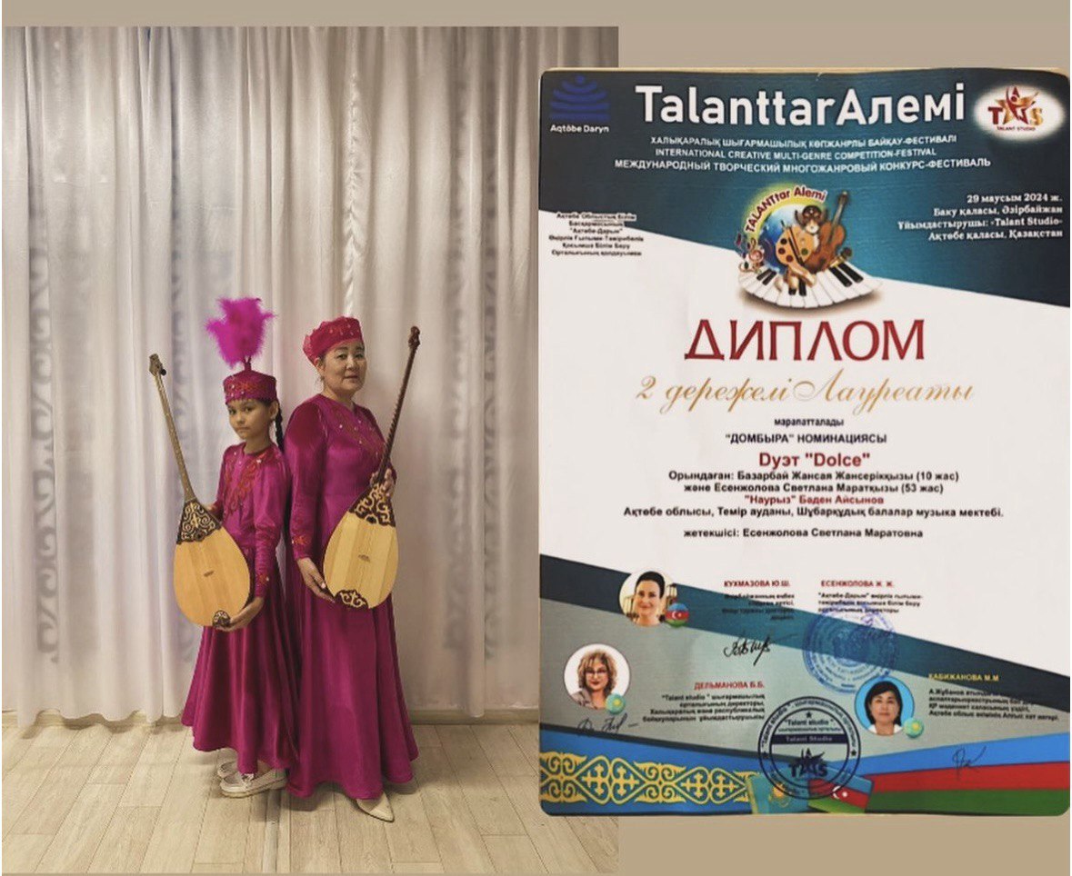Ақтөбе облыстық білім басқармасының «Ақтөбе-Дарын» өңірлік ғылыми-тәжірибелік қосымша білім беру орталығының қолдауымен өткен Халықаралық шығармашылық көпжанрлы «TALANTTAR ALEMI» байқау-фестивалінде «Домбыра» номинациясы бойынша мектебіміздің оқушысы Асхат Аялым ІІ ДӘРЕЖЕЛІ ЛАУРЕАТ, «Dolce» дуэті ІІ ДӘРЕЖЕЛІ ЛАУРЕАТ иегерлері атанды.