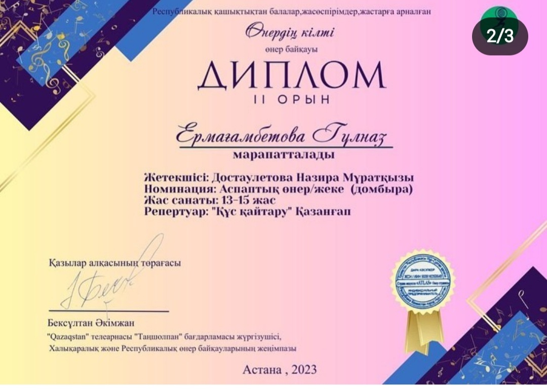 Республикалық қашықтықтан балалар, жасөспірімдер, жастарға арналған «Өнердің кілті» өнер байқауында «Аспаптық өнер» номинациясы бойынша Орынбай Темірлан І орын, Ермағамбетова Гүлназ ІІ орынға ие болды