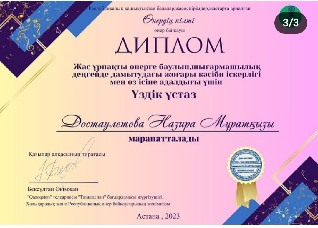 Жетекшісі Досдаулетова Назира Мұратқызы «Үздік ұстаз» номинациясымен марапатталды.