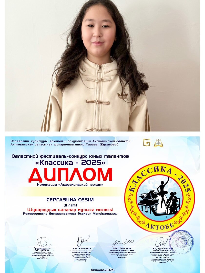 Облыстық “Классика-2025” жас таланттар фестиваль-конкурсының “Академиялық вокал” номинациясы бойынша мектебіміздің вокал класының оқушысы Сергазина Сезім қатысып, дипломмен марапатталды.